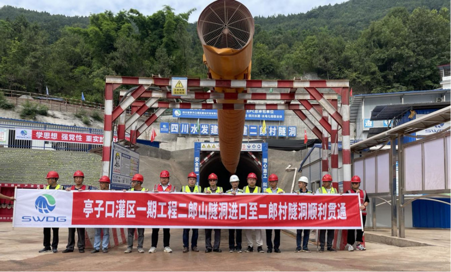 ?二郎山隧洞是EPC第Ⅰ標次關鍵線路,是亭子口一期工程第三長、Ⅰ標第二長隧洞,共設置3條施工支洞。由水發設計公司牽頭,水發建設公司負責施工。隧洞總長8140.7m,其中進口至第1條施工支洞——二郎村分水洞共1.6km。進口工作面與二郎村分水洞分別于2022年11月14日和2023年4月4日開始主洞施工,雙向掘進,月均進尺212m,歷時7.5個月完成。施工前,總承包牽頭設計與施工充分論證,優化分水洞設計,成功避讓地質災害區。施工過程中牢牢把握“紅層”地區地下洞室水平巖層,薄層易掉塊的特點針對性的開展質量與安全管理工作。