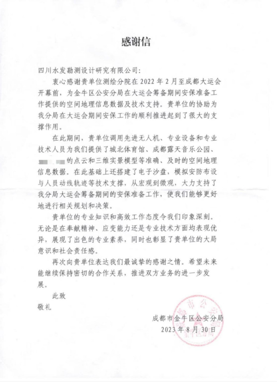 信中指出,設計公司測繪分院在大運會籌備期間所展現出的專業知識和高效的工作態度令金牛區公安分局印象深刻,無論是在奉獻精神、應變能力還是專業技術方面均表現優異,展現了出色的專業素養,同時也彰顯了設計公司的大局意識和社會責任感。