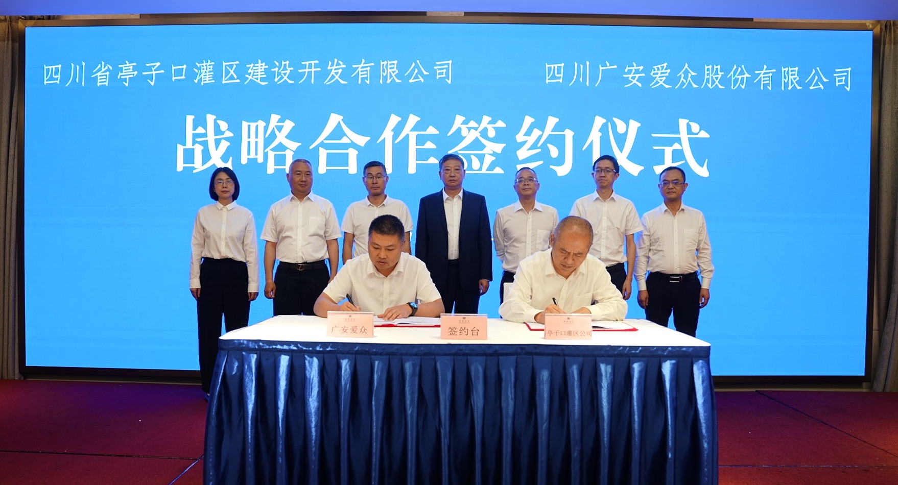 10月18日,四川省亭子口灌區建設開發有限公司與四川廣安愛眾股份有限公司戰略合作簽約儀式在廣安富盈酒店舉行。省水發集團董事羅國書,廣安愛眾公司黨委書記、董事長余正軍,黨委副書記、總經理何臘元;亭子口灌區公司黨委書記、董事長廖建強,黨委副書記、副董事長、總經理文祥明出席儀式。