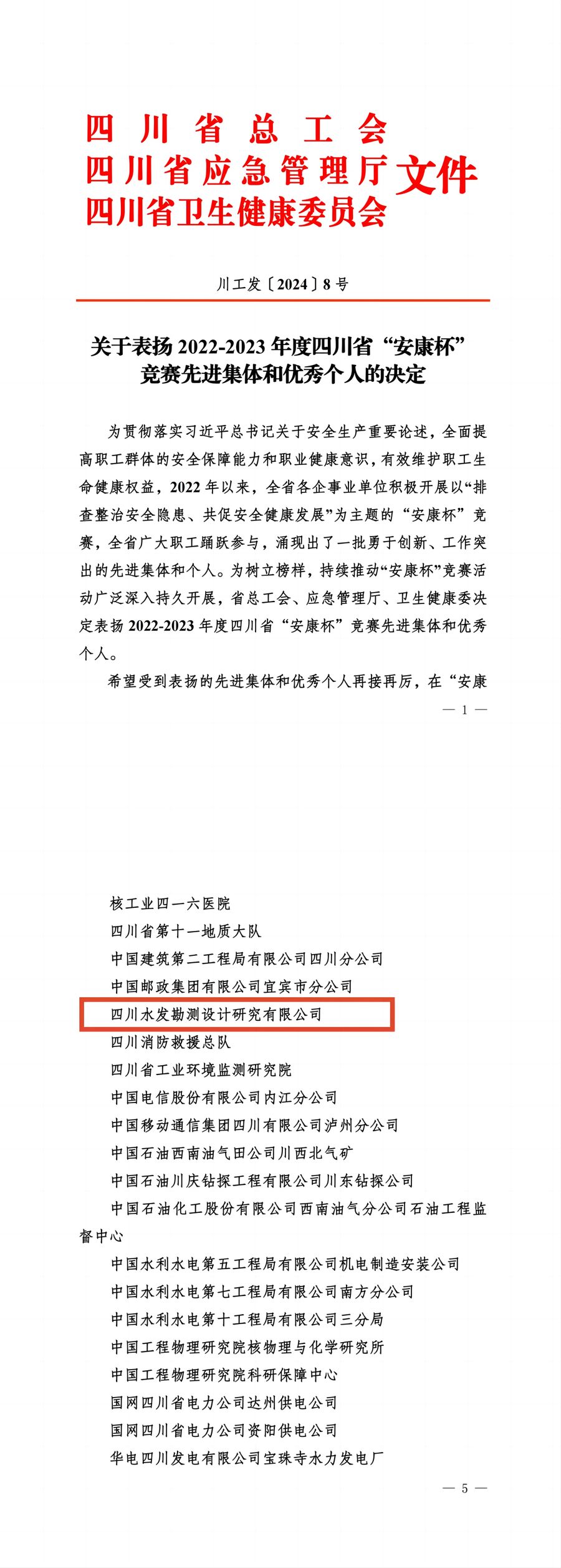 近日,四川省總工會(huì)、四川省應(yīng)急管理廳、四川省衛(wèi)生健康委員會(huì)聯(lián)合表揚(yáng)2022—2023年度四川省“安康杯”競賽先進(jìn)集體和優(yōu)秀個(gè)人,設(shè)計(jì)公司獲得2022—2023年度四川省“安康杯”競賽先進(jìn)集體。?