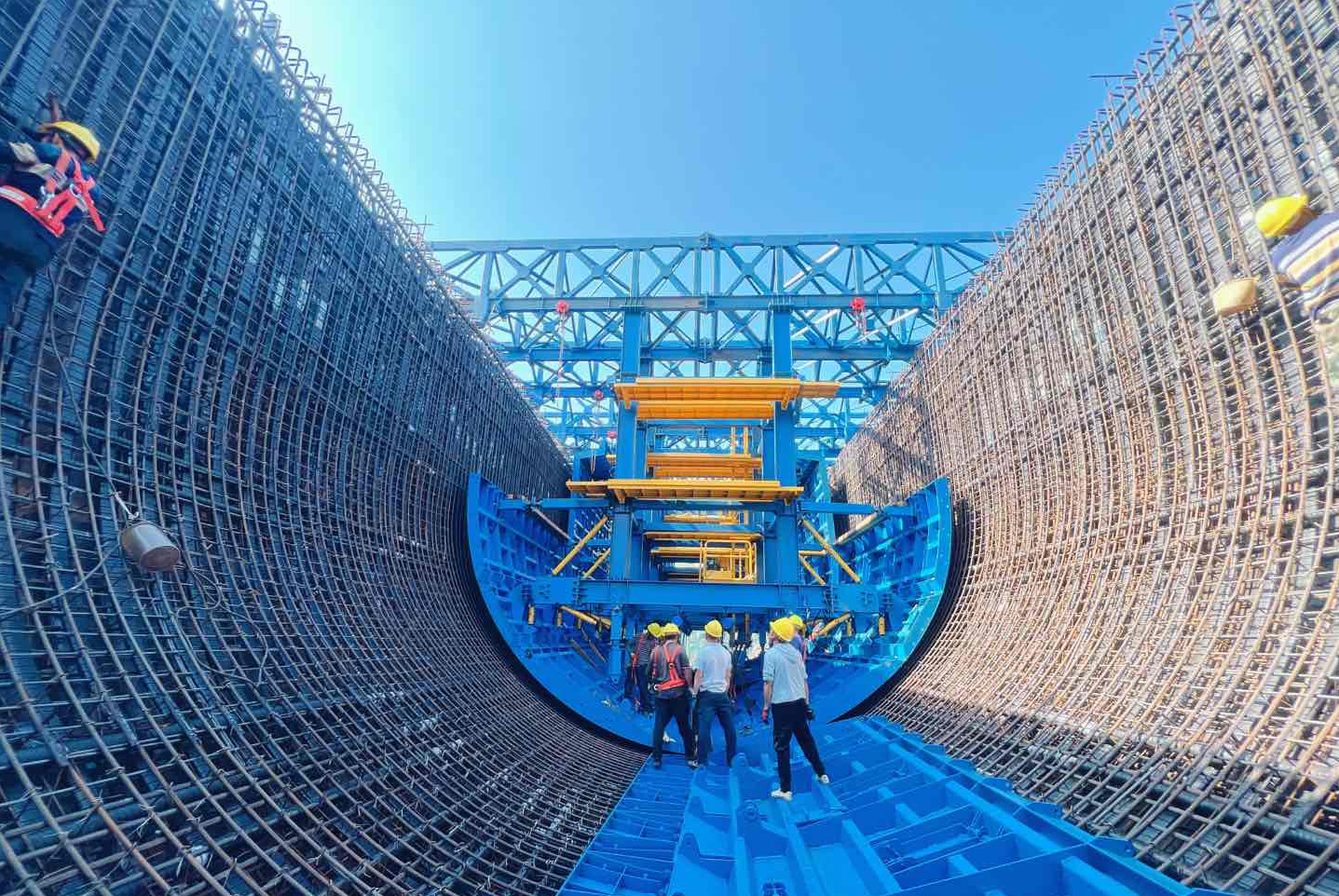 自2021年4月項目進場施工以來,四川水發(fā)向家壩灌區(qū)公司強化要素資源保障和綜合統(tǒng)籌調(diào)度,組織參建各方全力以赴攻堅克難。一是開展了槽身1:1原型仿真試驗,全面檢驗設(shè)計參數(shù)及施工工藝,對發(fā)現(xiàn)的問題提出了優(yōu)化措施之后再進行正式的槽身施工。二是根據(jù)現(xiàn)場環(huán)境實際,創(chuàng)新性的將托架支撐和膺架支撐進行了結(jié)合,形成了“托-膺架”支撐系統(tǒng),為工程的安全施工創(chuàng)造了良好的施工場地。三是聯(lián)合國內(nèi)優(yōu)秀的模板制造商,研發(fā)了“大直徑高架U型渡槽分段自行模板裝備”,降低了模板的安拆、吊裝風(fēng)險,并大大地提高了施工工效。四是大力開展創(chuàng)新工作,采取澆筑一倉總結(jié)一倉的方式,及時討論研究解決施工過程中發(fā)現(xiàn)的問題,在施工過程中,共形成了6項專利技術(shù),總結(jié)了10項新型的施工工法。