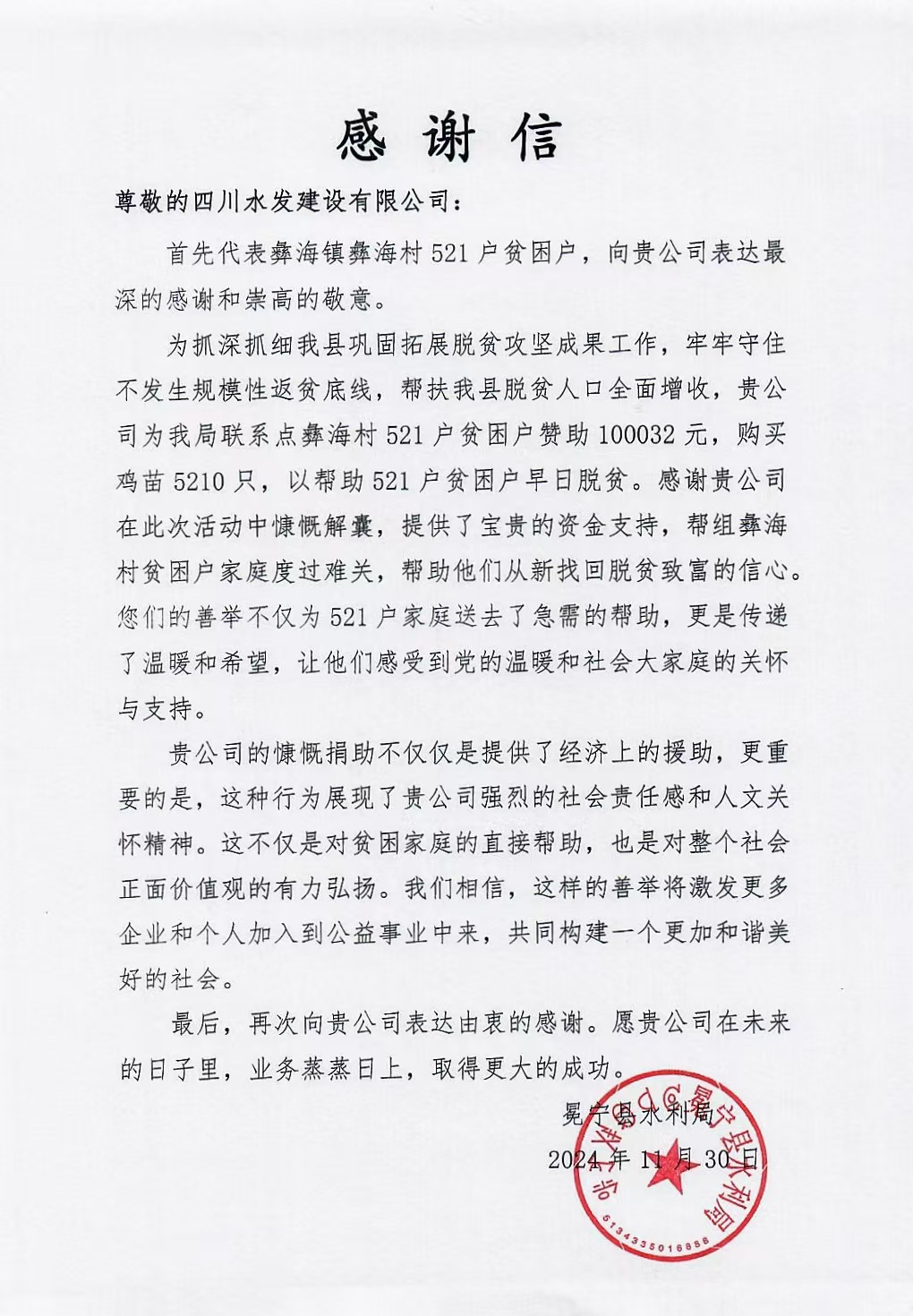 近日,建設公司收到了來自涼山州冕寧縣水利局的感謝信,涼山州冕寧縣水利局對建設公司在冕寧縣彝海鎮彝海村開展的系列幫扶舉措表示感謝。