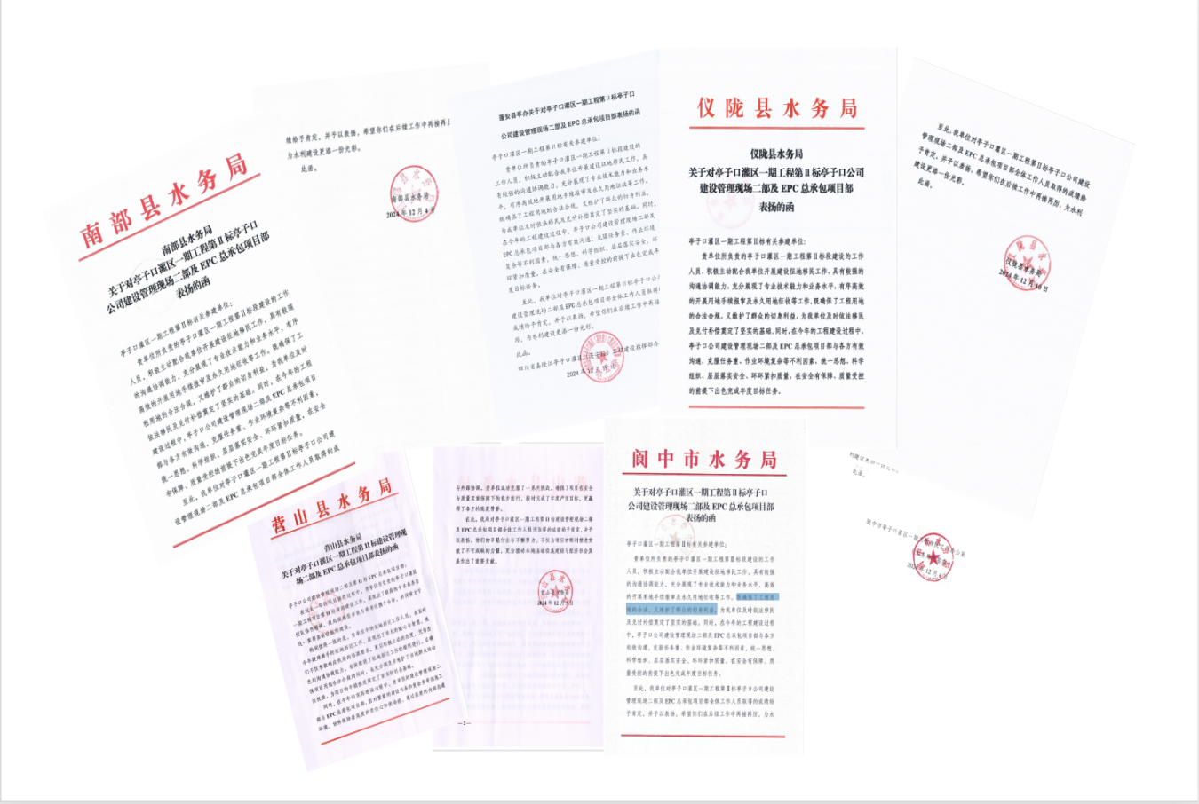 近日,亭子口灌區一期工程EPC第Ⅱ標段項目部收到閬中市、儀隴縣、蓬安縣、南部縣、營山縣等五縣(市)水務局的聯合表揚。