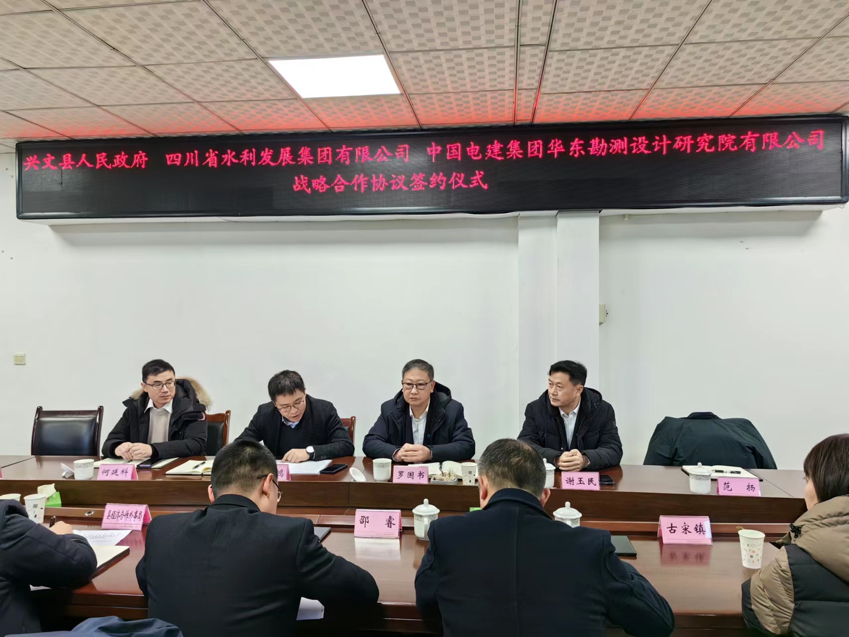 集團(tuán)項目前期工作部負(fù)責(zé)人謝玉民、經(jīng)營管理部相關(guān)工作人員,興文縣領(lǐng)導(dǎo)江北春、戴林沖,中電建華東院西南區(qū)域總部何延科、郭榮利參加了簽約儀式。