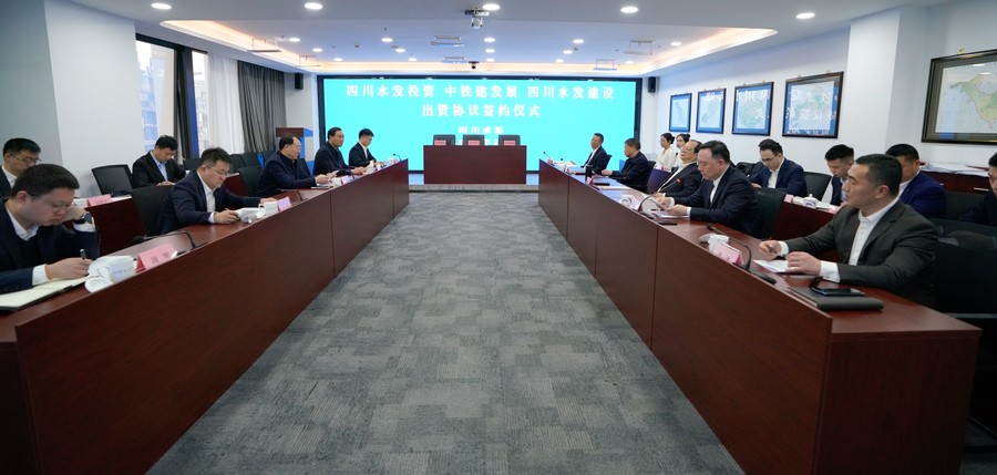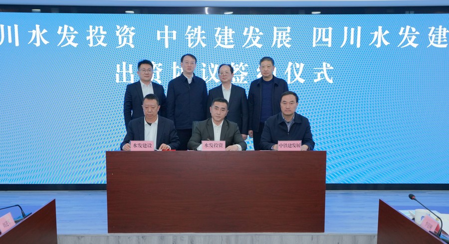 四川水發(fā)投資有限公司黨委副書(shū)記、總經(jīng)理郎波,四川水發(fā)建設(shè)有限公司副總經(jīng)理李銀剛,中鐵建發(fā)展集團(tuán)公司副總經(jīng)理劉小剛共同簽署出資協(xié)議。
