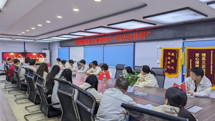 各下屬企業結合自身實際,聚焦宣傳引導,利用公司門戶網站、微信公眾號專欄、電子顯示屏等宣傳陣地,推送普法文章,營造濃厚宣傳氛圍;聚焦思想引領,注重發揮領導帶頭示范作用,亭子口公司組織開展“憲法宣傳周”學習會,引大濟岷公司通過總經理辦公會會前學法,大力加強憲法學習,強化憲法意識,弘揚憲法精神;聚焦基層一線,向家壩公司在項目建設工地張貼宣傳海報,組織觀看憲法宣傳片,亭子口公司結合主題黨日活動,在項目一線進行“弘揚法治精神 助力灌區建設”普法宣教,推動憲法精神深入項目一線,擴大輻射效應。