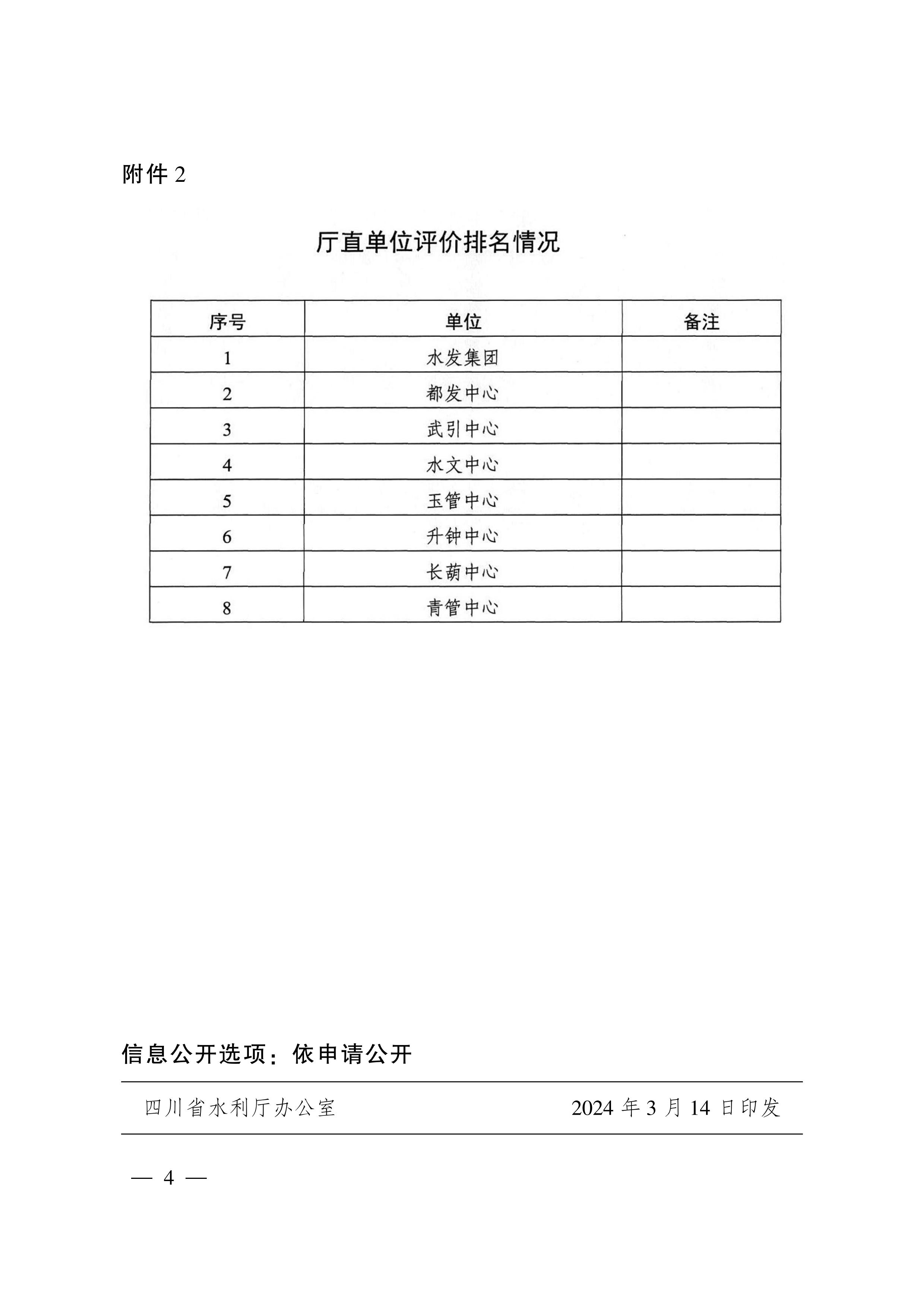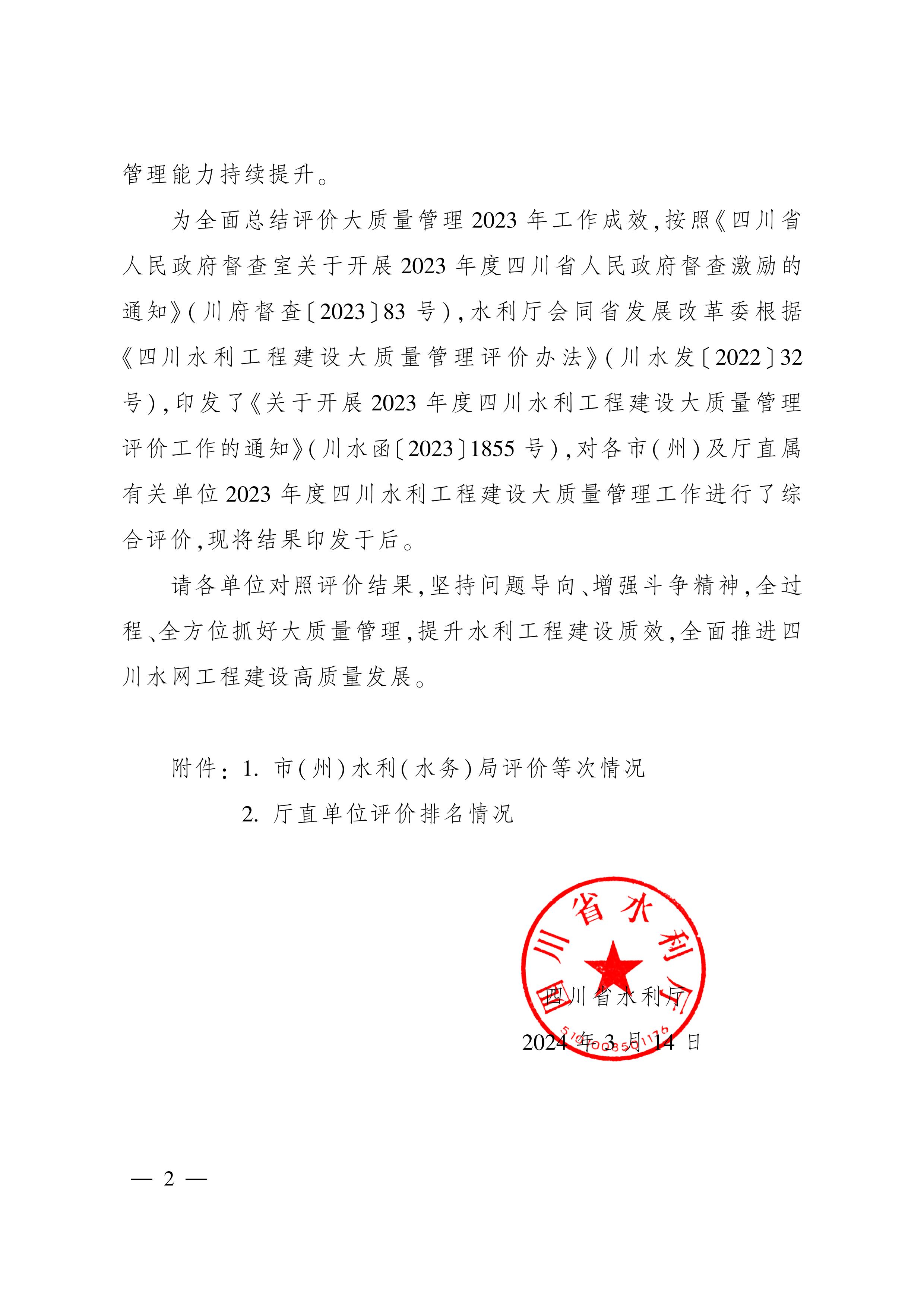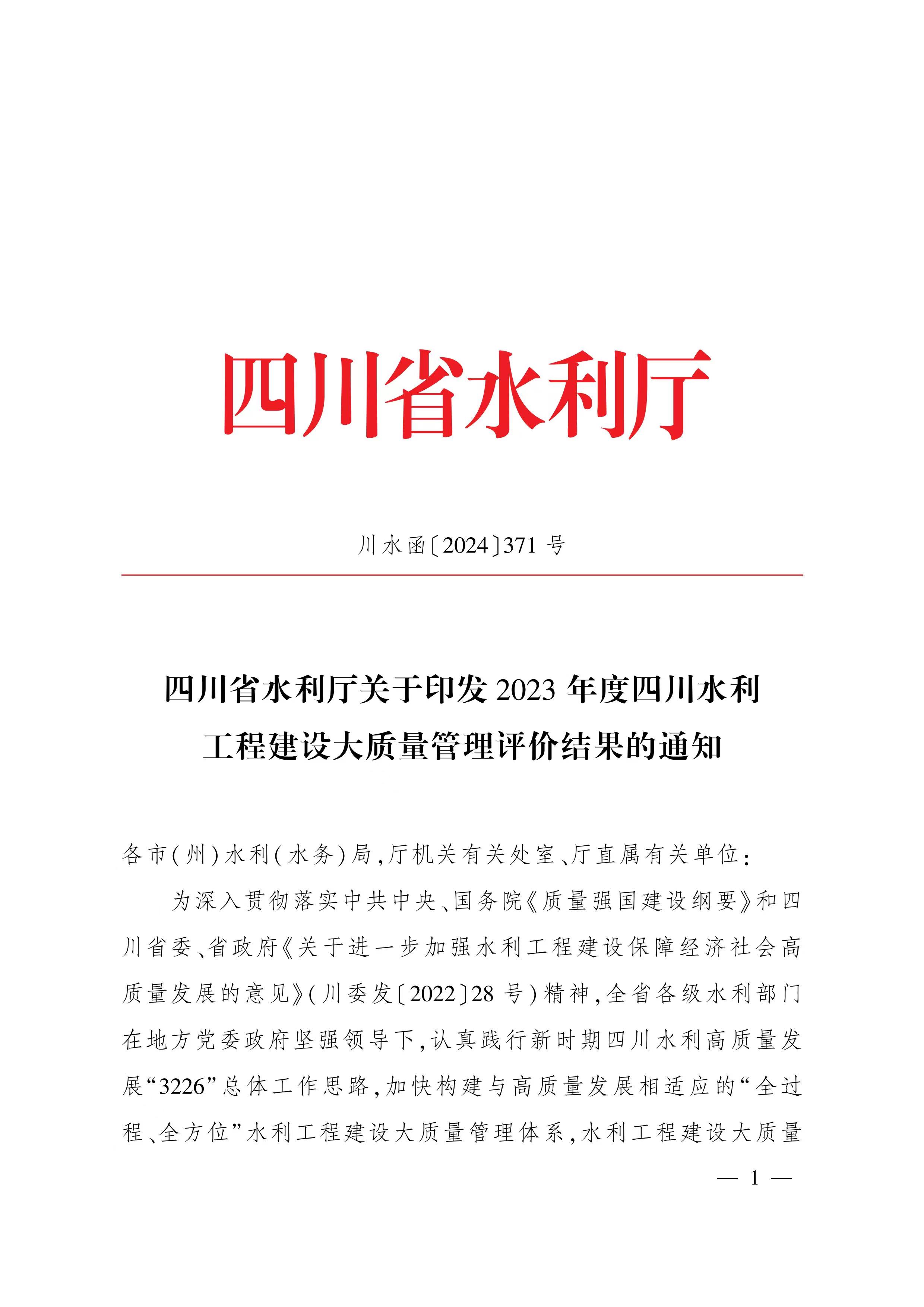 2024年3月14日,水利廳印發了2023年度四川水利工程建設大質量管理評價結果,四川省水發集團在2023年度四川水利工程建設大質量管理評價結果中成功榮獲廳直單位評價排名第一名。