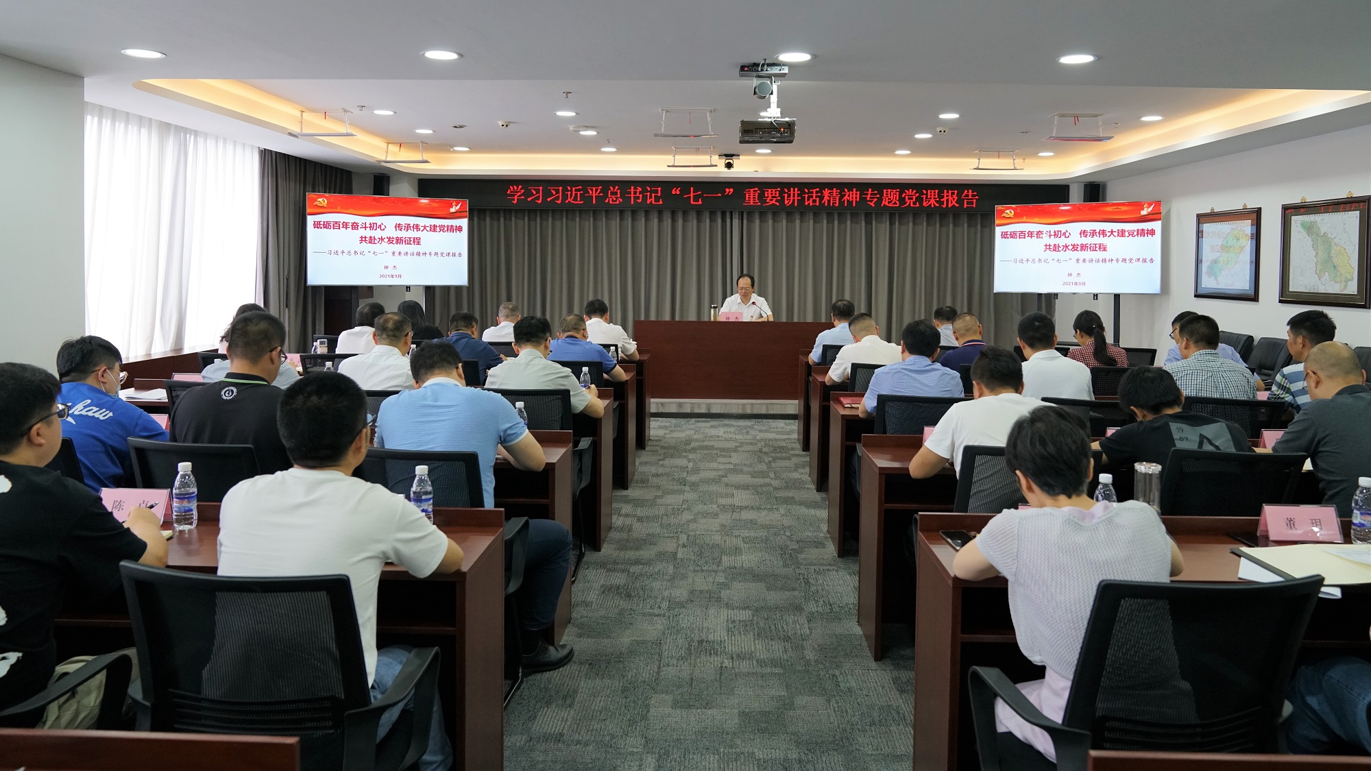 按照省水發集團黨史學習教育統一安排,9月13日,集團黨委書記、董事長鐘杰以《砥礪百年奮斗初心,傳承偉大建黨精神,共赴水發新征程》為題,就深入學習貫徹習近平總書記“七一”重要講話精神為集團總部職工講授了專題黨課。集團總部全體職工參加此次會議。
