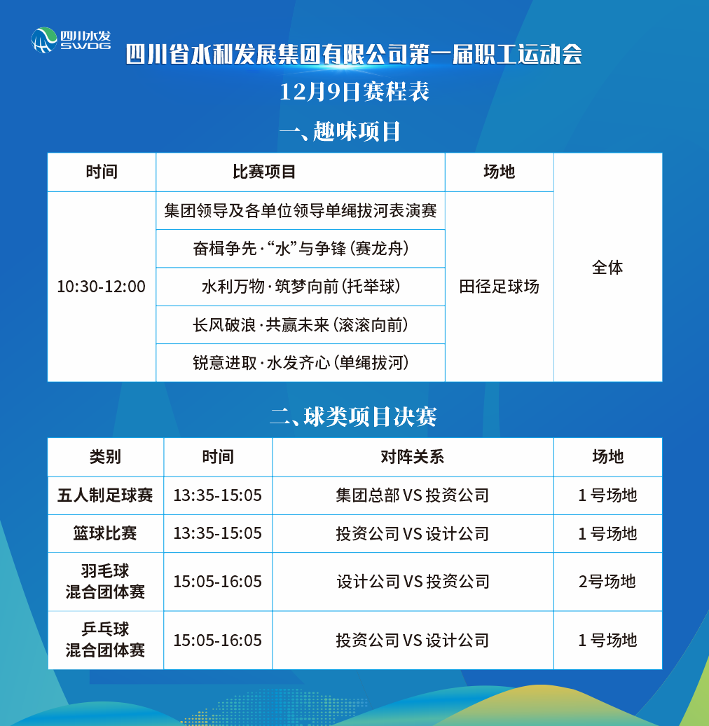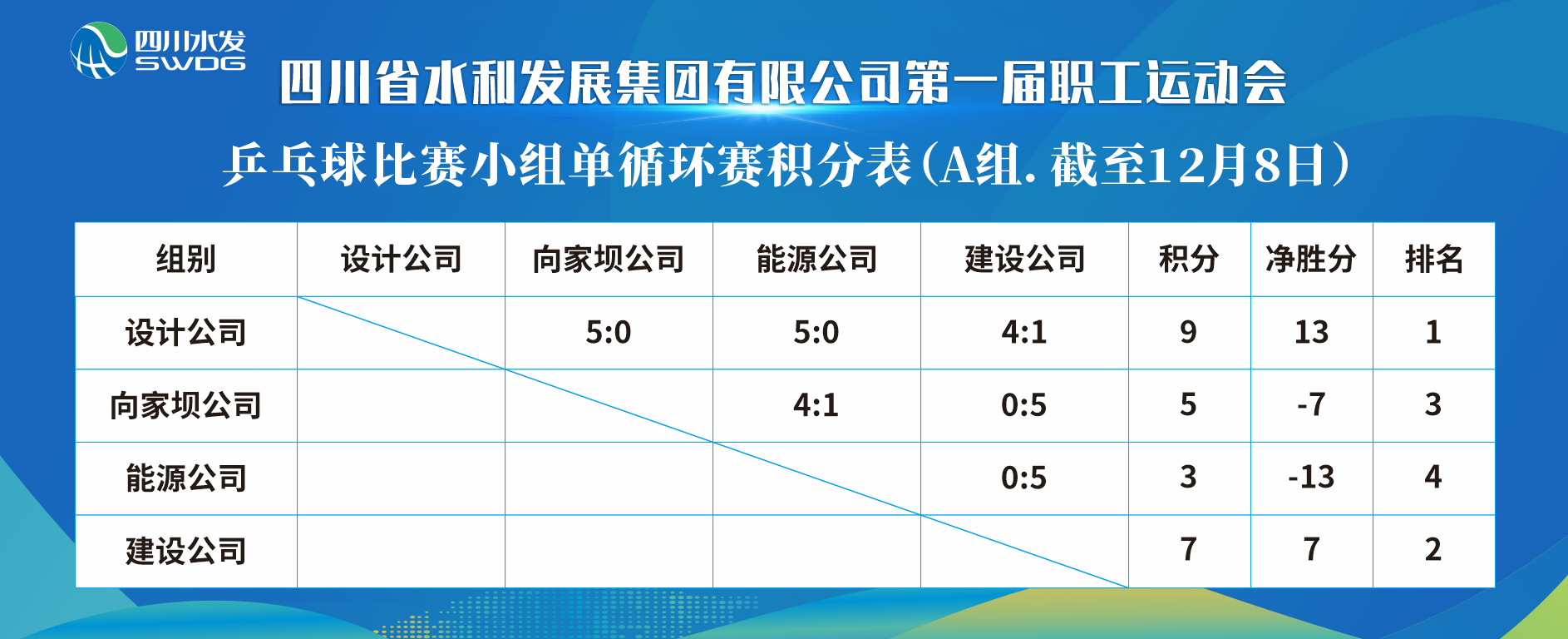 自12月5日運動會開賽至今,水發集團首屆職工運動會第一階段的小組循環賽已全部結束。積分榜上,8支隊伍積分你追我趕。最終進入決賽的隊伍分別是籃球(投資公司 VS 設計公司),乒乓球(投資公司 VS 設計公司),足球(集團總部 VS 投資公司),羽毛球(投資公司?VS?設計公司)。