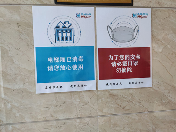 電梯里貼上了暖心的抽紙,門把手也勤消毒做到重點(diǎn)防范。