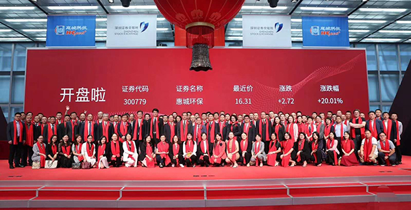 5月22日上午,青島惠城環保科技股份有限公司上市儀式在深圳證券交易所東門8樓大廳正式啟動。青島市地方金融監管局副局長王偉光、青島惠城環保科技股份有限公司董事長張新功、中德證券有限責任公司首席執行官段濤致辭,隨著開市寶鐘的敲響,惠城環保正式上市。