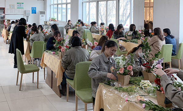 活動特邀花藝講師進行講解示范,在介紹了插花的造型要素和技巧手法后,講師通過現場演示,指導大家制作出一簇簇精美的花藝作品。一支支黃玫瑰、紫羅蘭、洋甘菊......經過女同胞們的巧手修剪、色彩搭配,構思細致地置入花籃,變的錯落有致、賞心悅目,也寄托了大家對美的理解和對幸福的感悟。