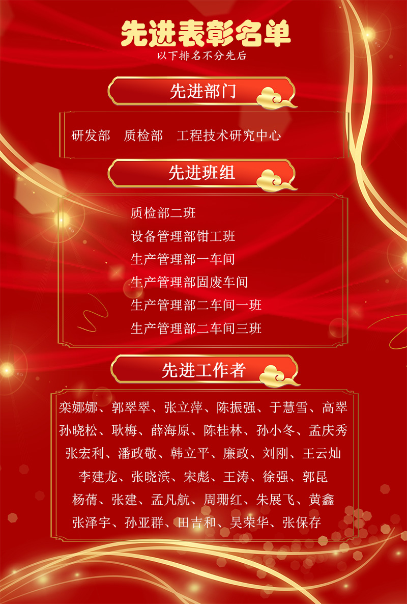 為表彰先進,樹立楷模,1月24日下午,公司2021年度先進表彰儀式在研發中心會議室隆重舉行,儀式現場對先進工作者、先進班組、先進部門進行表彰嘉獎。公司董事長、總經理張新功,公司各級經營管理干部及先進工作者、先進班組及部門代表參加了儀式。