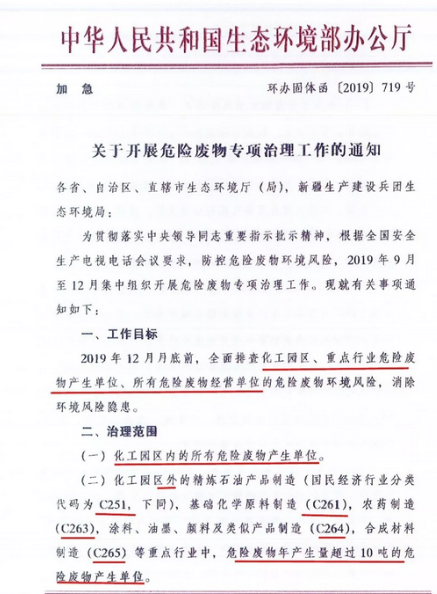 日前生態(tài)環(huán)境部印發(fā)加急文件《關(guān)于開(kāi)展危險(xiǎn)廢物專(zhuān)項(xiàng)治理工作的通知》。 《通知》要求今年年底前,在全國(guó)范圍內(nèi)排查化工園區(qū)、重點(diǎn)行業(yè)危險(xiǎn)廢物產(chǎn)生單位、所有危險(xiǎn)廢物經(jīng)營(yíng)單位的危險(xiǎn)廢物環(huán)境風(fēng)險(xiǎn),消除環(huán)境風(fēng)險(xiǎn)隱患。