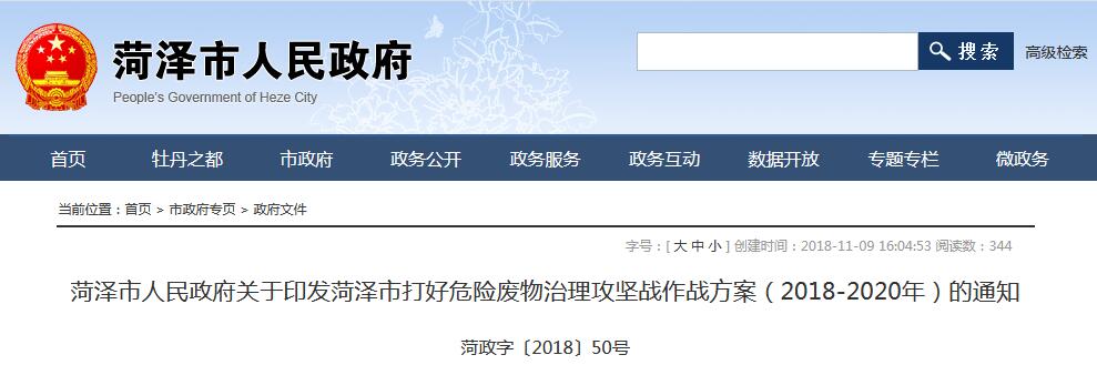 菏澤市人民政府關于印發(fā)菏澤市打好危險廢物治理攻堅戰(zhàn)作戰(zhàn)方案(2018-2020年)的通知