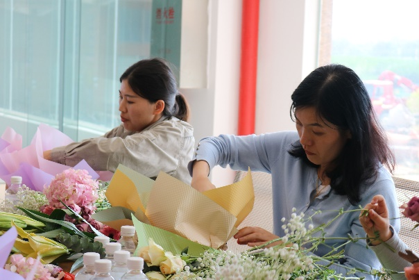 在由玫瑰花、洋桔梗、繡球花、百合、滿天星之香氣調和而成的陣陣馨香中,花藝師向女職工們講解插花知識,介紹花材的名稱、養護方案、花材的處理和修剪方法,示范插花步驟,女職工們聚精會神地學習后認真設計自己的花籃,相互討論,時不時迸發出爽朗的笑聲,經過精心設計,一個個形態飽滿、充滿生命力的花籃就誕生了,大家紛紛拿出手機,記錄下這美好的時刻。